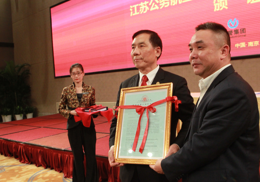 昨日,民航江苏监管局副局长秦晨阳于南京市江宁区国际会展中心,向江苏公务航空有限公司总经理许建强颁发了CCAR-135部航空运营人运行合格证。这标志着全国首家以省命名的公务航空公司具备了正式营运的资格。